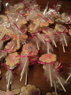 Pretty dragonflies and flower Sugar cookies on a stick. Nothing is more fun to eat! I use sanding sugar and royal icing to decorate each cookie and them wrap them each individually with a pretty pink bow.